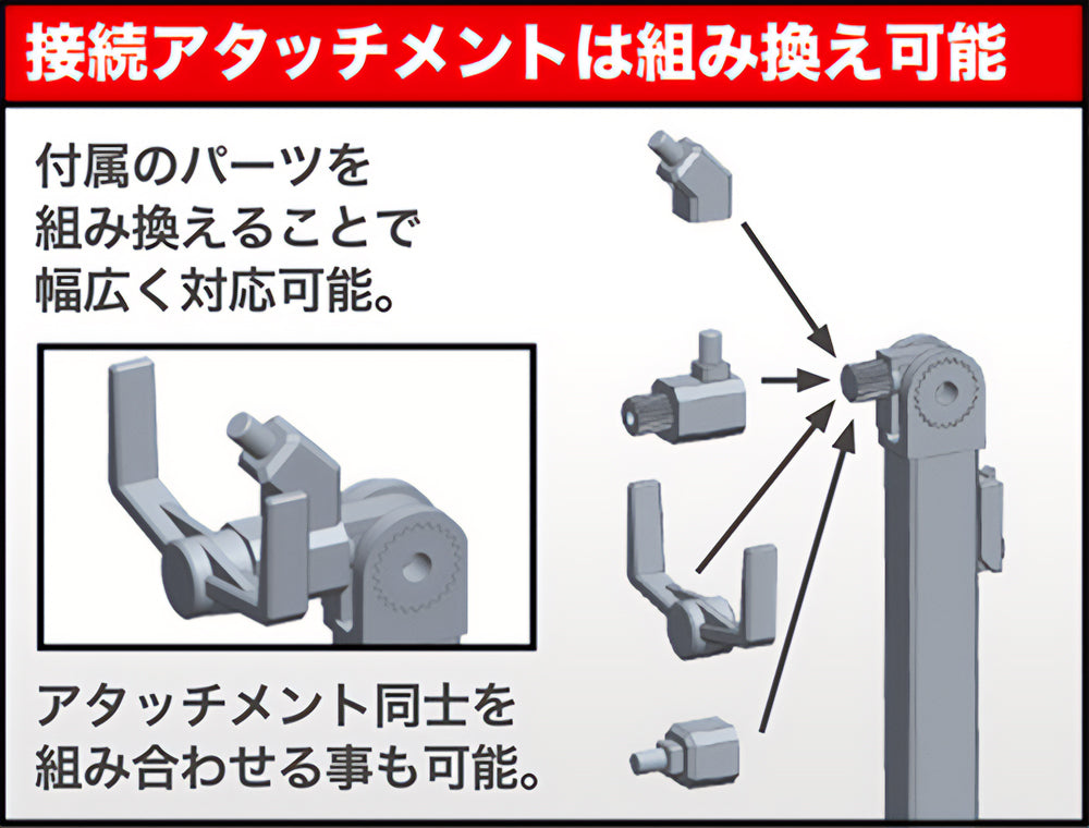 ■ The connection attachment features multiple joints that can be used in combination. In addition an angleable claw is provided for more stable displaying.