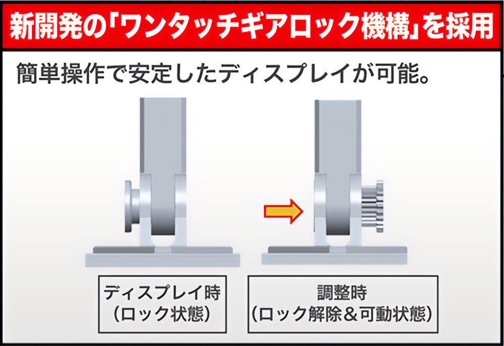 This base features a one-touch locking gear mechanism for easy use and stable display!