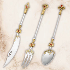 ■ Unique cute and whimsical designs that reimagine cutlery as weapons. Embedded with jewels, the pommels feature three variations based on playing card suits.