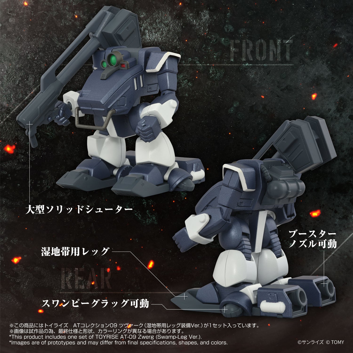 The L-Class AT Zwerg arrives with a completely new mold, compact and perfectly recreating its distinctive silhouette. Includes the Wetland Leg parts (attachable to both legs) featured in the game version, the handheld searchlight used in the TV anime, and the large Solid Shooter used by Strike Dog (the Zwerg body itself is the same as the Sand Loader equipped version). This product is a scale action figure with articulated joints.