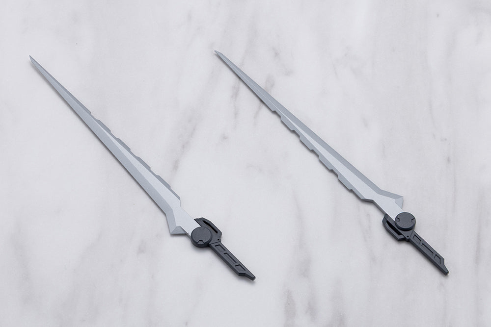 They can also be attached to the included grips to function as single-edged long swords.