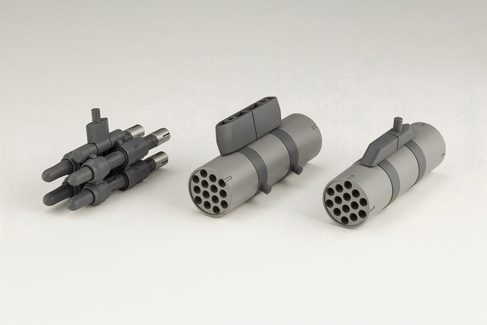 Effective in its simplicity, MISSILE & ROCKET POD joins the WEAPON UNIT series lineup. The missiles can be removed from the pylon, and the articulated base of the pylon allows it to be opened and set level on a surface.