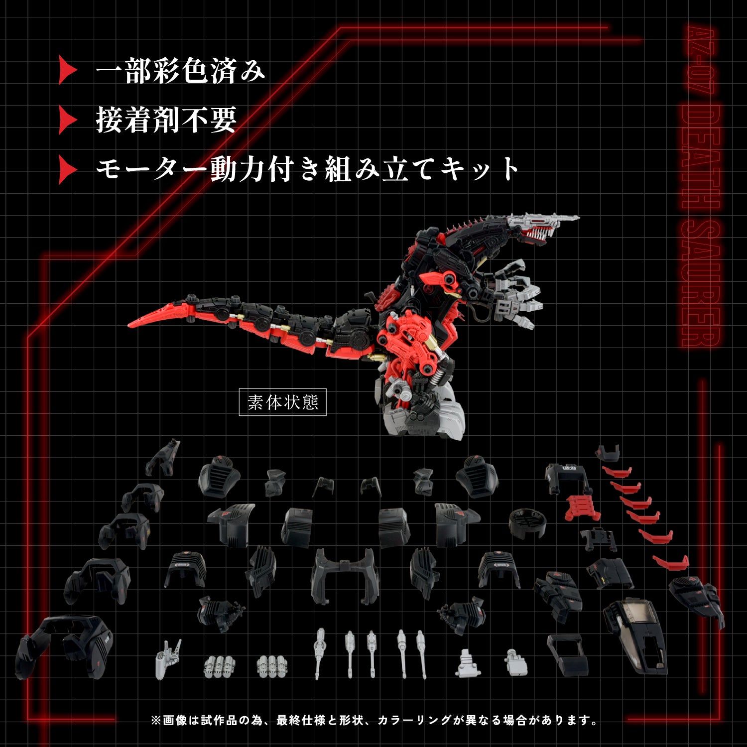 A 1/72 scale assembly kit. Powered by an electric unit, flipping the switch not only enables a walk with the compelling presence befitting a dinosaur, but also replicates the rotation of the charged particle forced intake fans that were characteristic in the anime. LEDs light up the eyes, neck, chest, charged particle cannons, and the back's charged particle forced intake fans. Included are figures of Prozen and an original general soldier, both possible to be seated in the cockpit, at a 1/72 scale of the anime characters. Additionally, a figure of Prozen in his distinctive standing pose from the anime is also included (all figures are unpainted). By switching the switch, it is also possible to enjoy the LED lighting gimmick on its own.