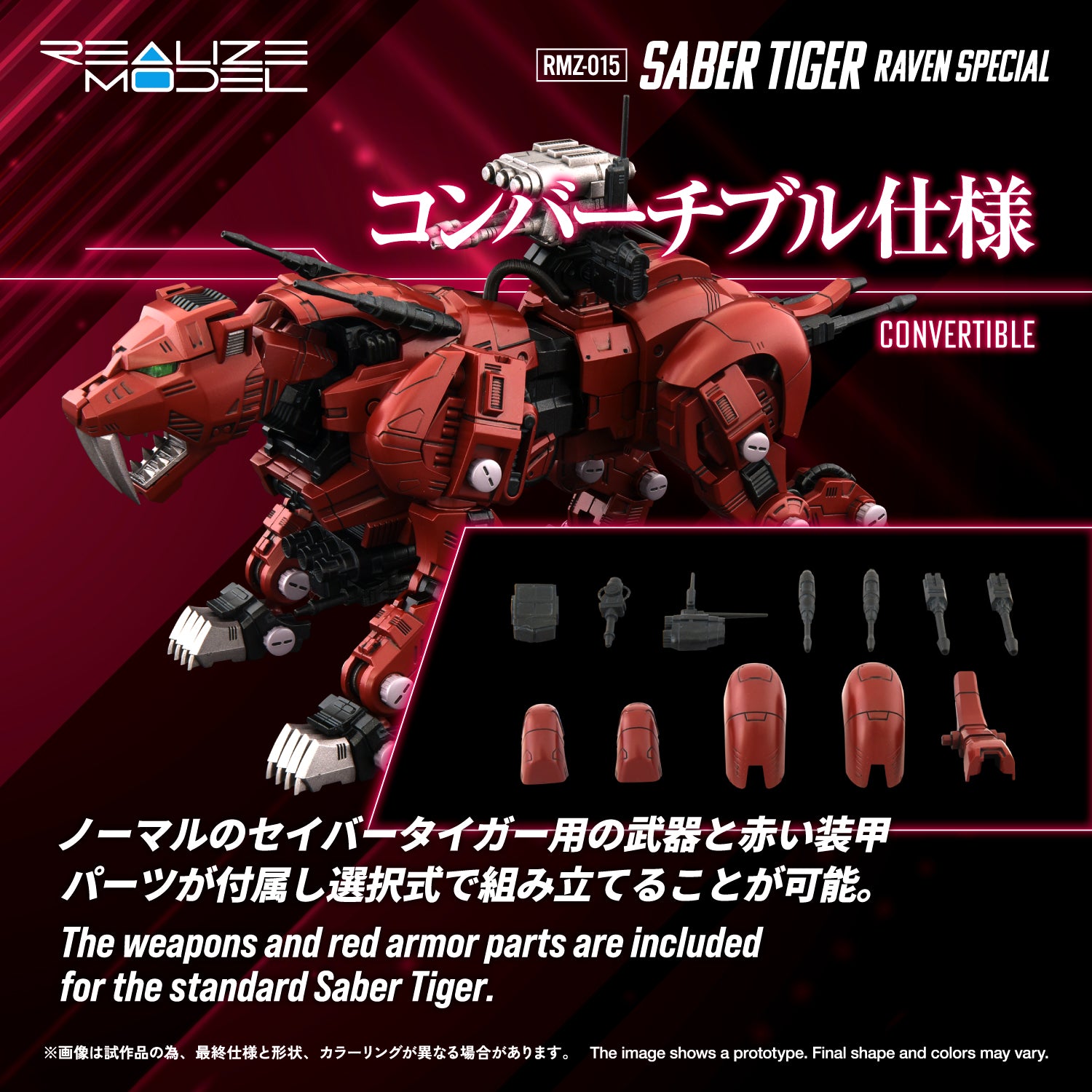 Its specially designed articulation allows full-body movement, enabling various action poses unique to the Tiger-type Zoids, such as sprinting or combat stances. Impressive damage scenes from the anime are recreated through part segmentation, and interchangeable front legs are included. Comes with pilot figures (Raven and a standard soldier) and an Organoid “Shadow (Wing Retracted)” figure.