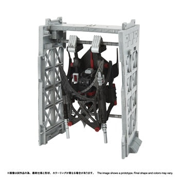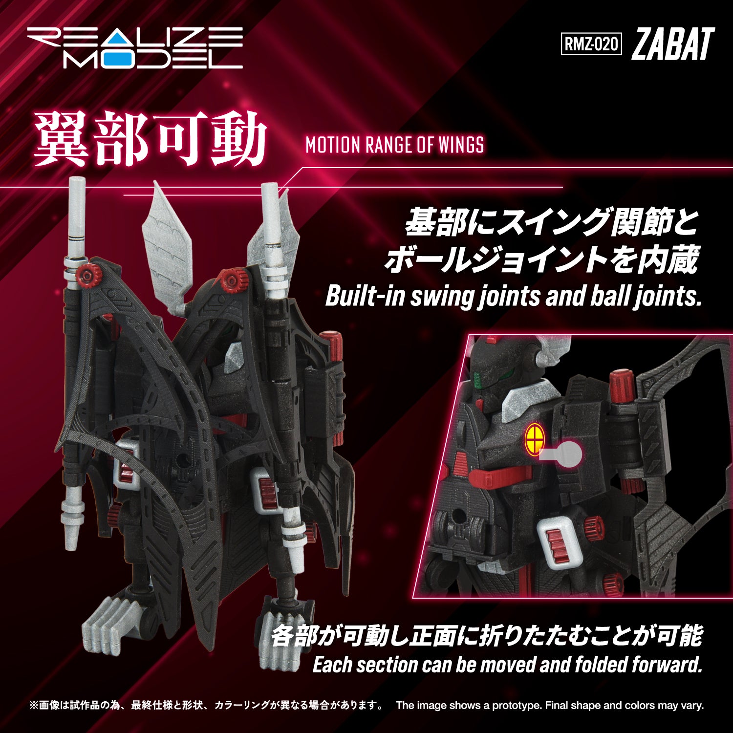 A specially designed articulation system allows full-body movement, enabling various action poses unique to bat-type Zoids, such as flight poses and hanging poses. The homing bomb stored in the abdomen is removable. The head can be assembled for either autopilot mode or manned flight mode. A pilot figure (general soldier) is included and can be seated in the cockpit for the manned flight mode.